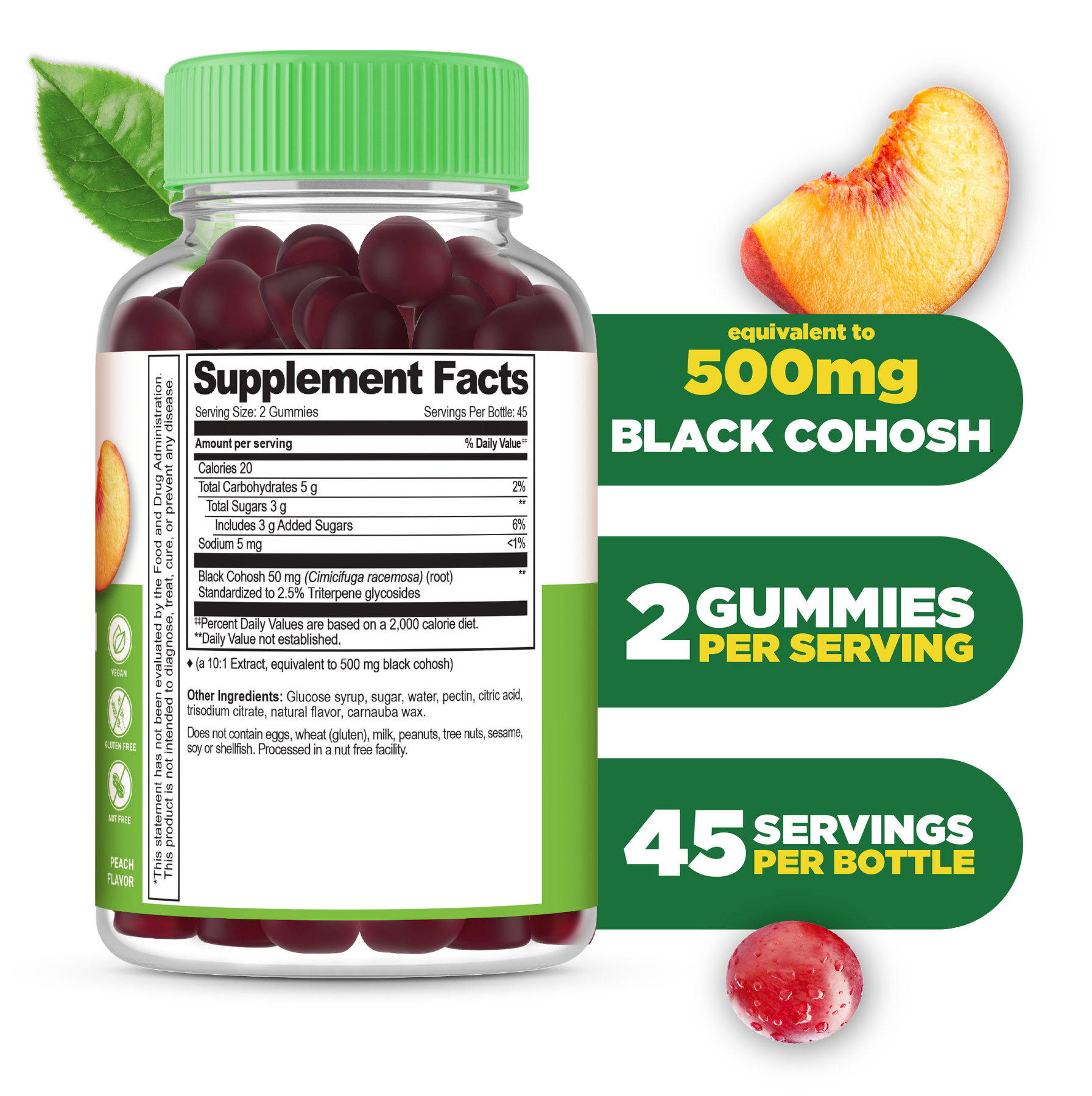Find your balance the tasty way! Black Cohosh is a traditional herbal nutrient that helps support overall wellness. These gummies make it easy and fun with a chewy bite and a refreshing peach flavor that turns healthy living into a daily treat!