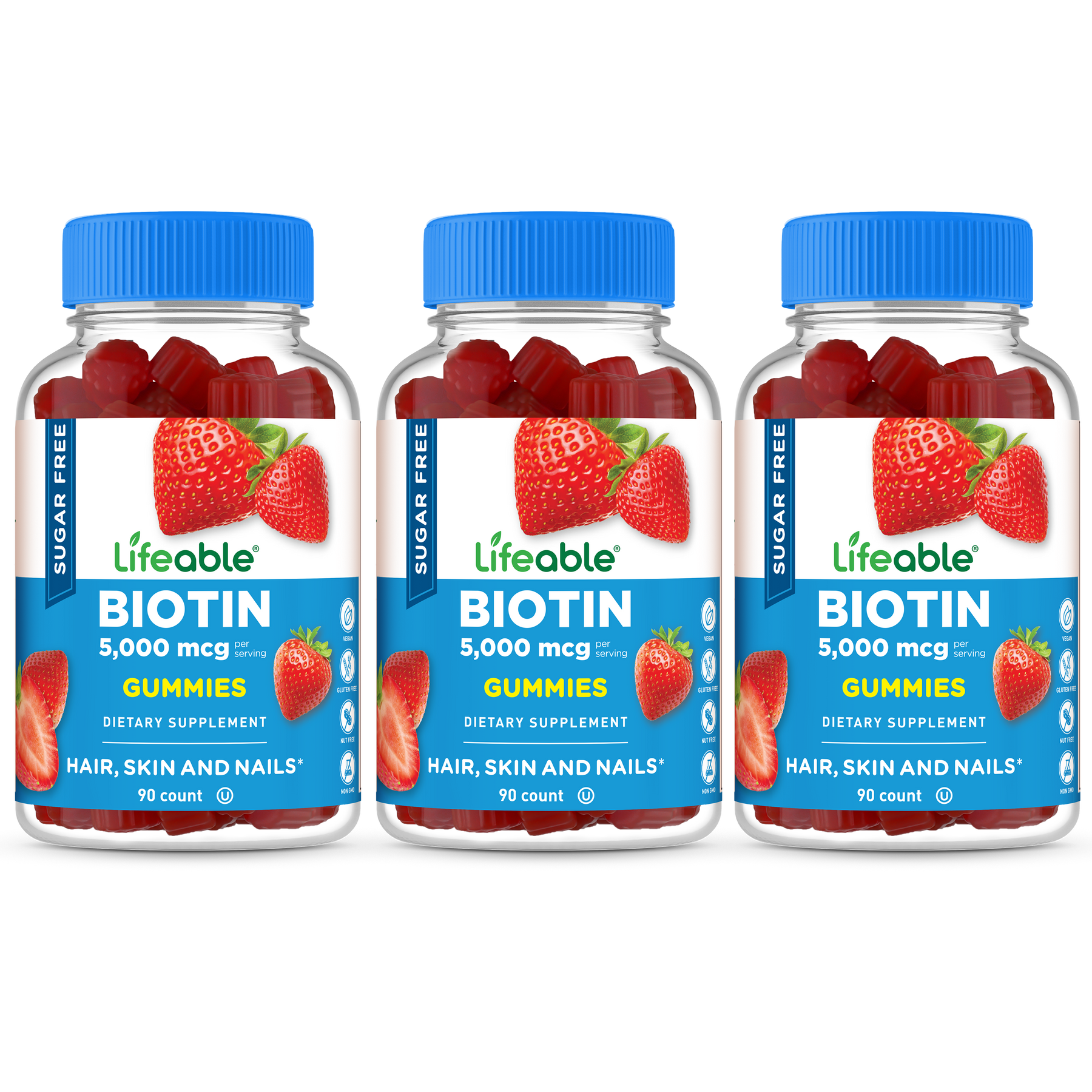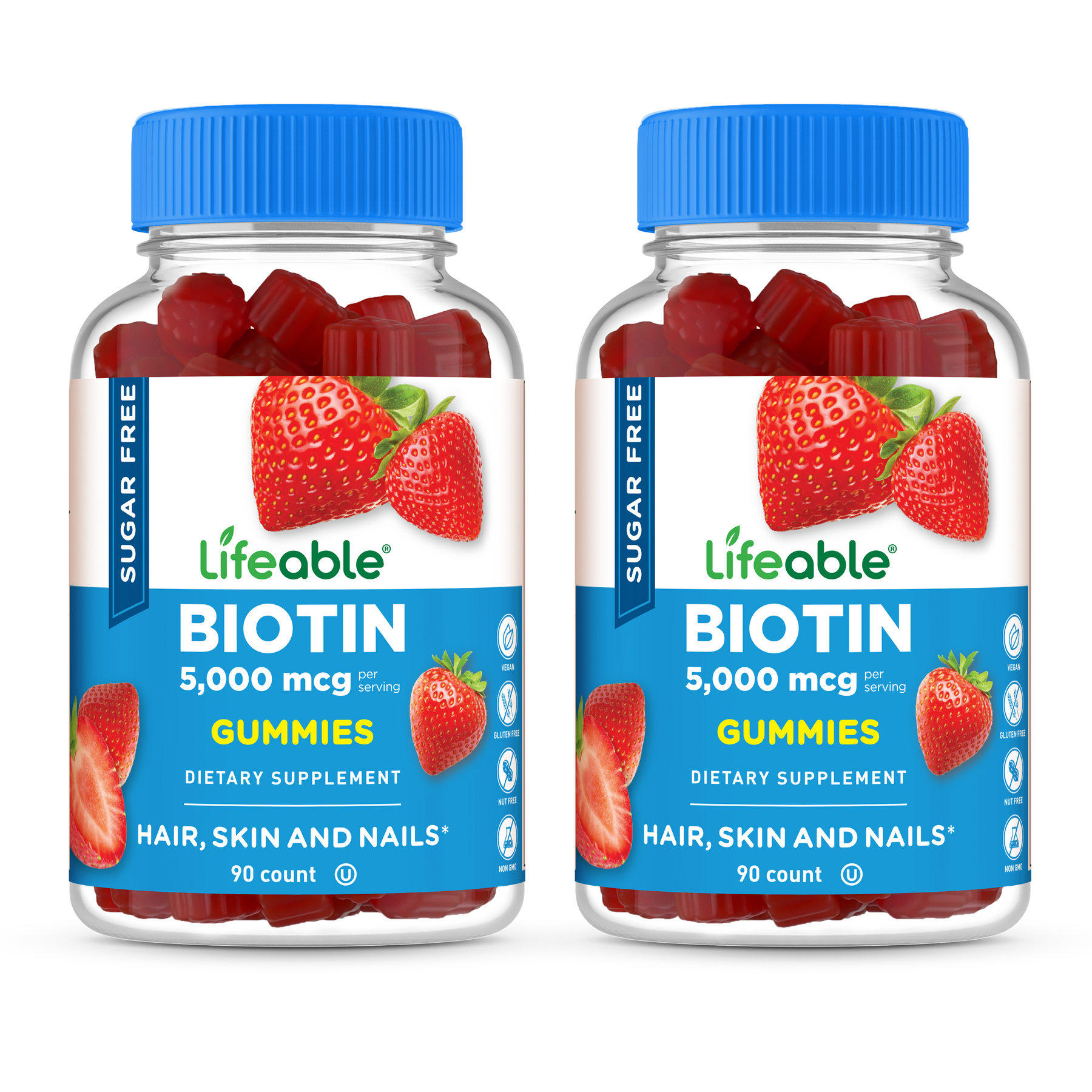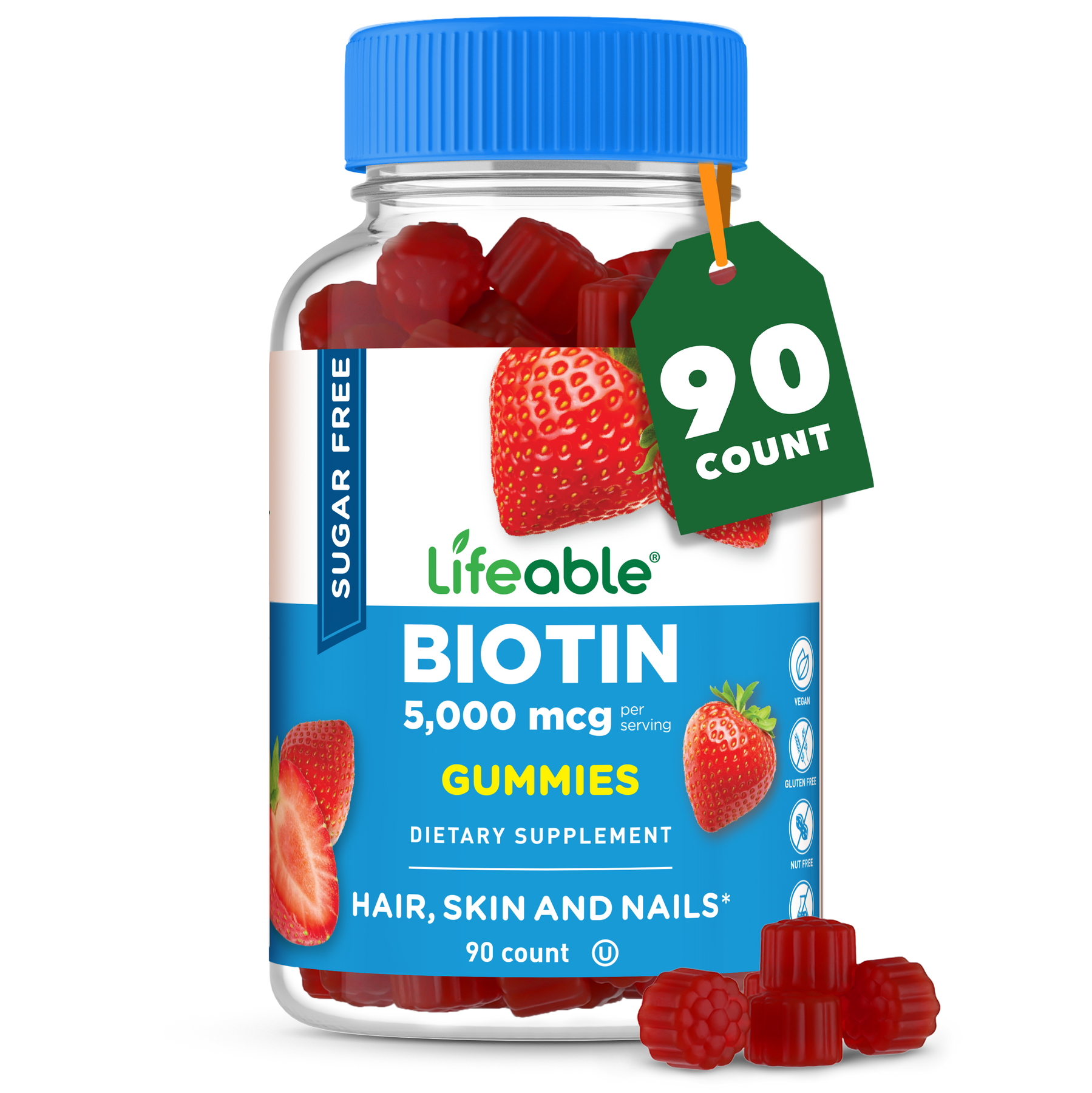 with a delicious raspberry flavor, each serving of these gummies provides 5,000 mcg of Biotin, a water soluble B vitamin, which studies show is important for supporting healthy hair, skin and nails.