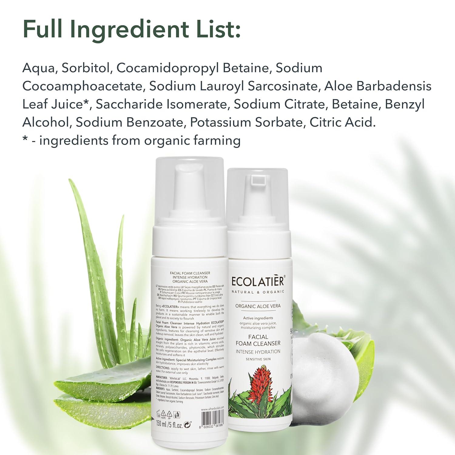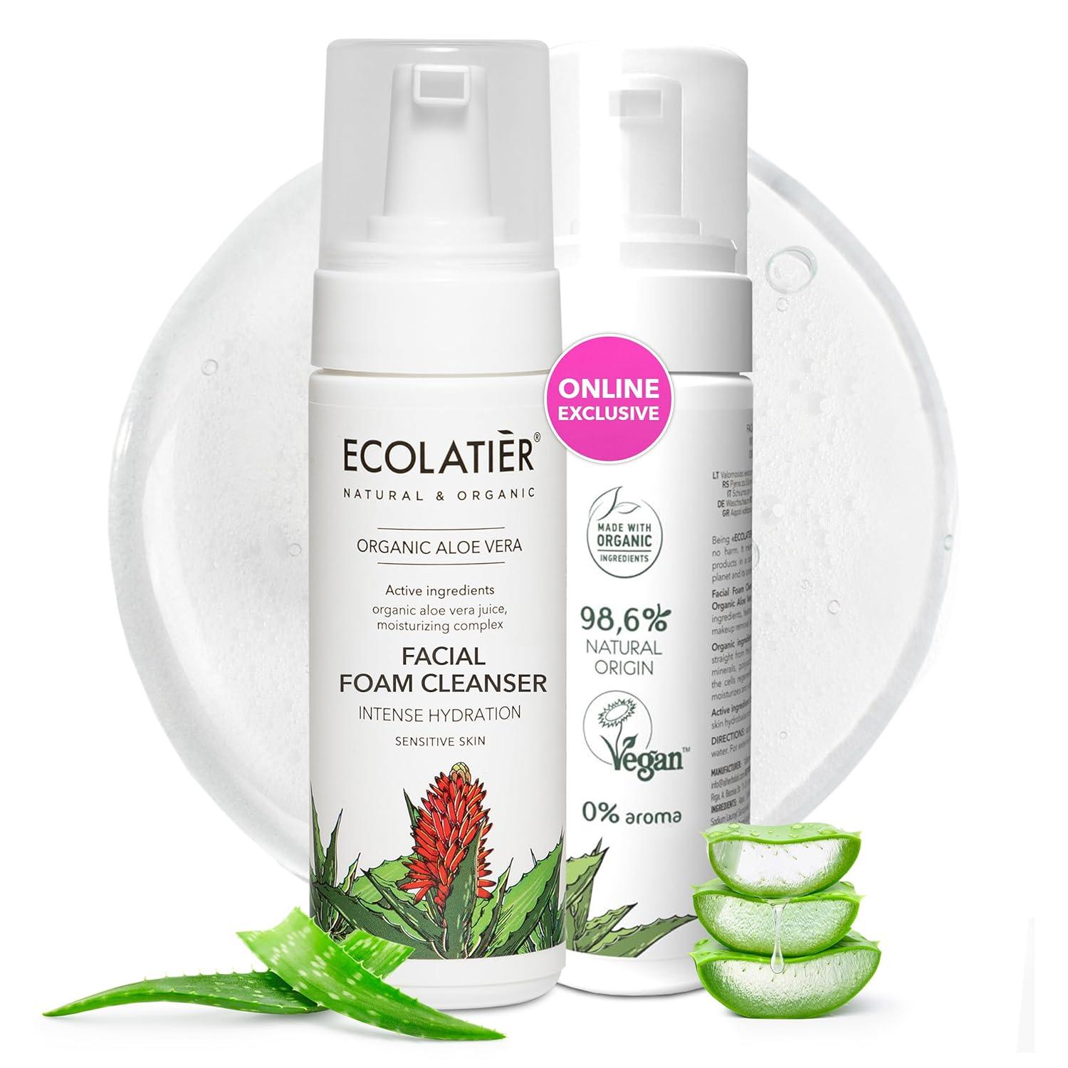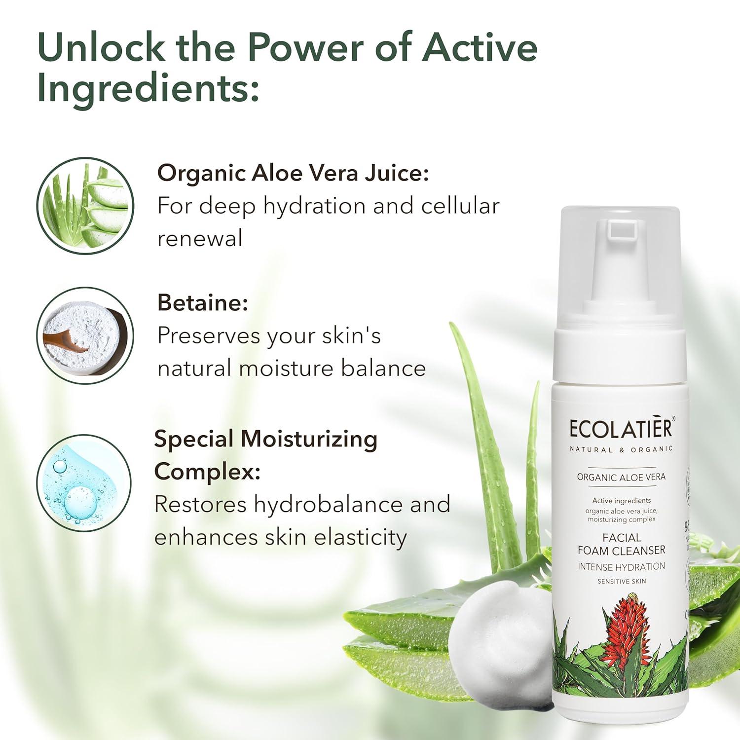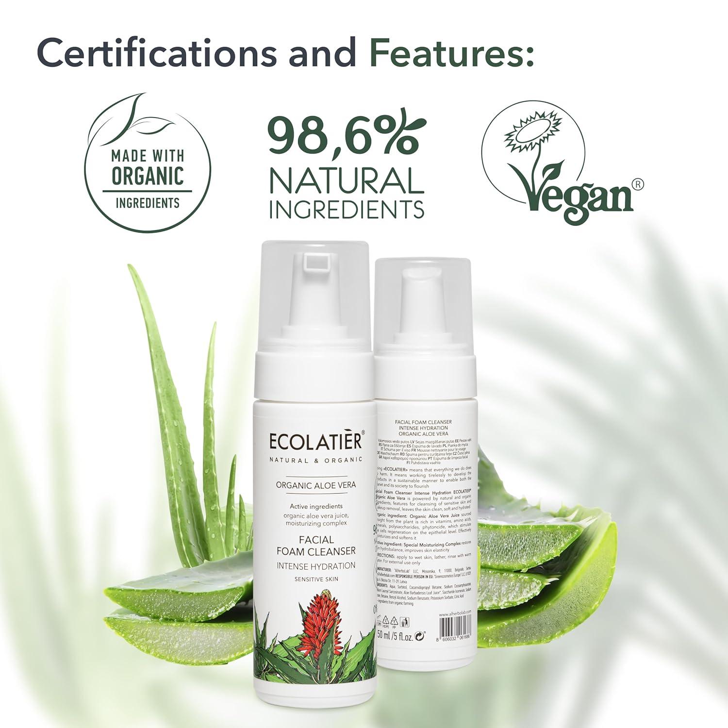 Facial Foam Cleanser  Intense Hydration ECOLATIER® Organic Aloe Vera is powered by natural and organic ingredients, features for cleansing of sensitive skin and makeup removal, leaves the skin clean, soft and hydrated