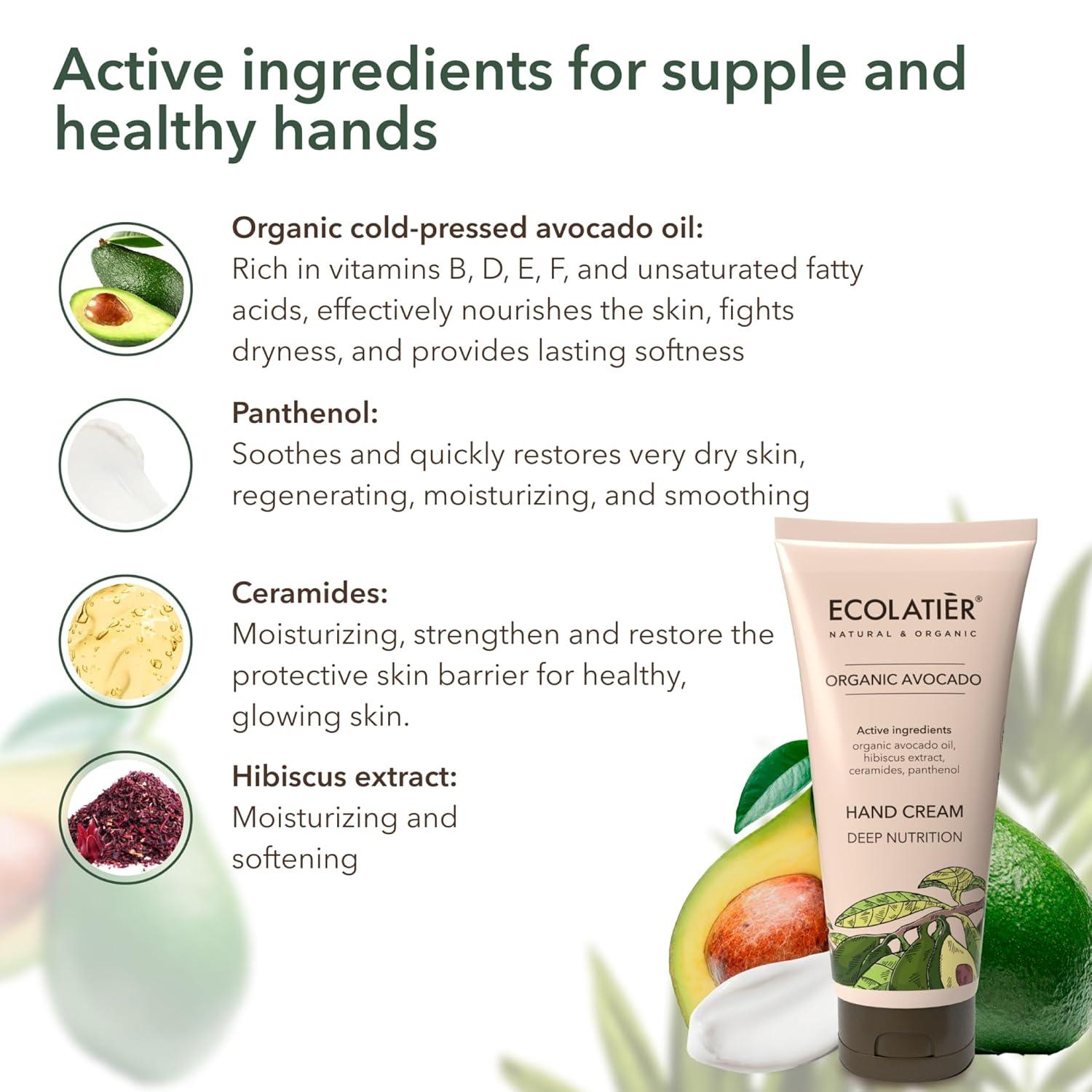 Hand cream ECOLATIER® Organic Avocado nourishes and restores hand skin and cuticles, protects from harsh climate. Skin becomes silky smooth and well moisturized. Safe for all skin types, worry-free ingredients and vegan-friendly