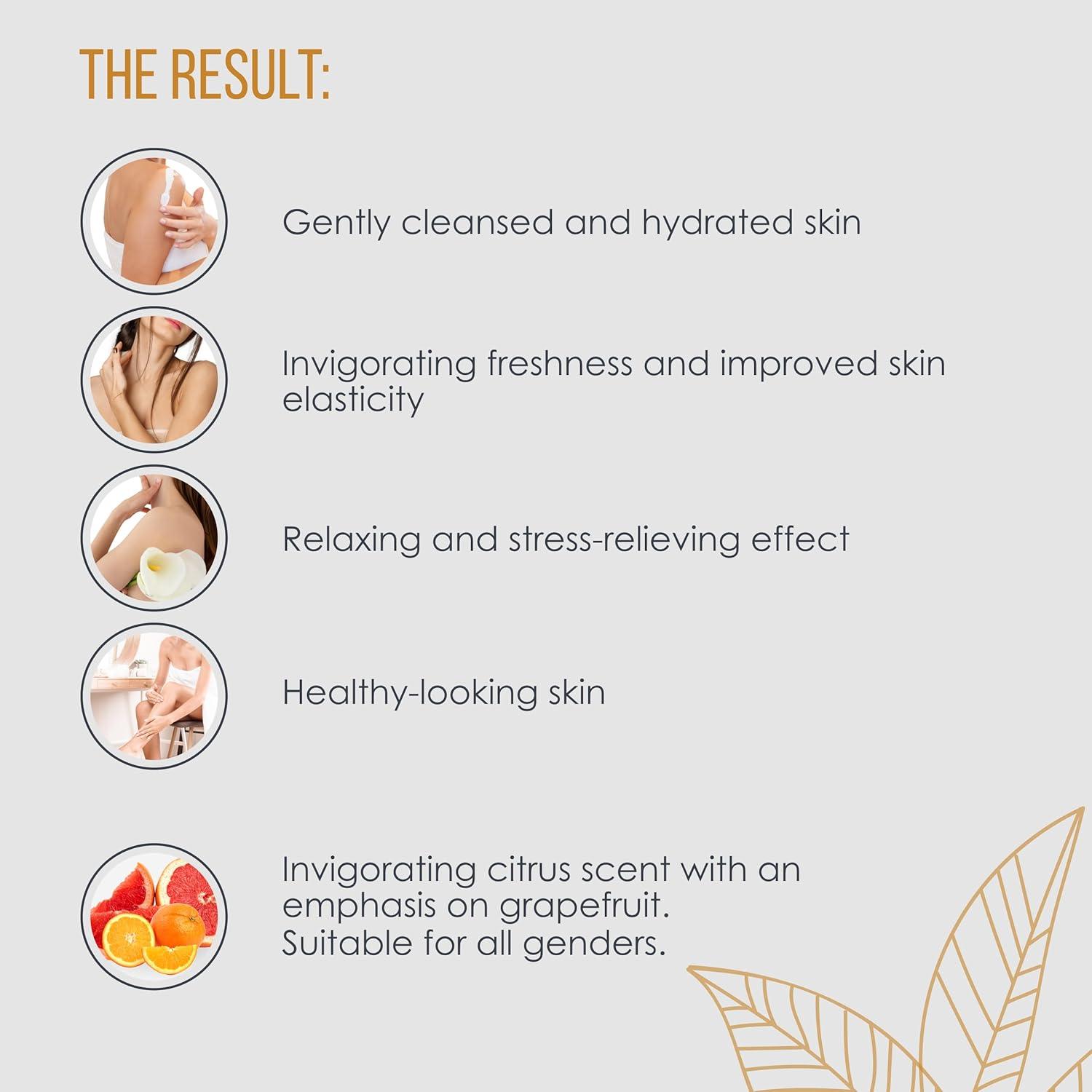 ACTIVE INGREDIENTS: Grapefruit Oil contains fruit acids and enzymes that remove old cells and start the regeneration process, and have a beneficial effect on the skin. The skin is cleansed, nourished, it becomes healthy-looking and elastic
