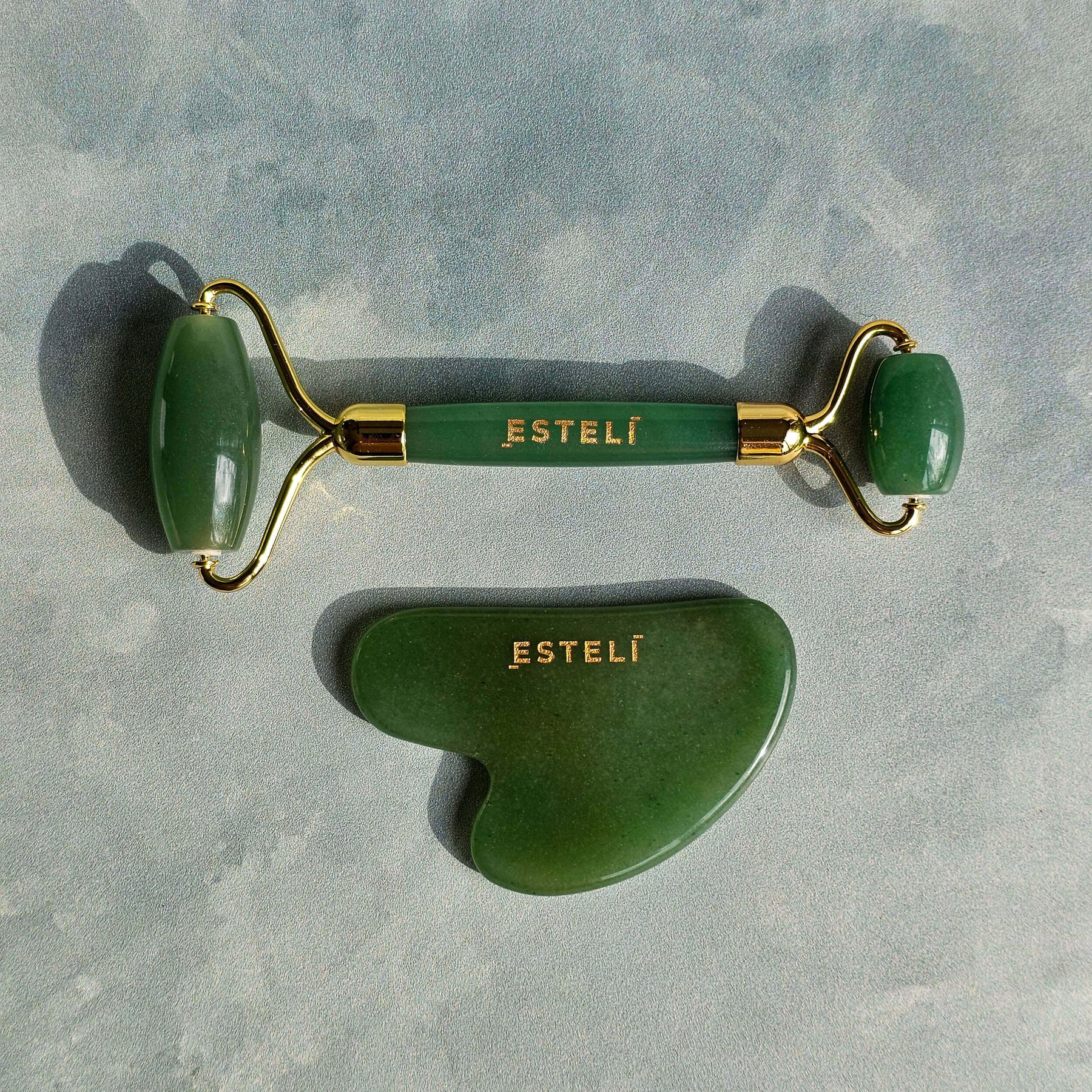 Experience the combined benefits of our Green Aventurine Facial Roller and Gua Sha in one luxurious set. Crafted from beautiful, cool-to-the-touch green aventurine, these tools work synergistically to enhance your natural beauty.